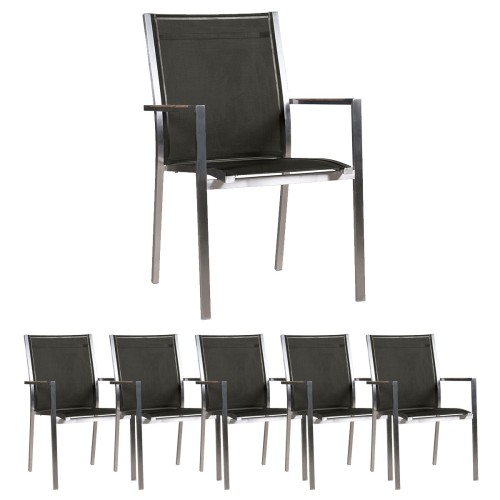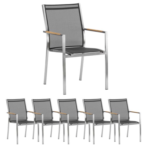 14. 6x Stern Stapelsessel Cardiff, Edelstahl mit Textilenbezug silbergrau und Teakarmlehnen