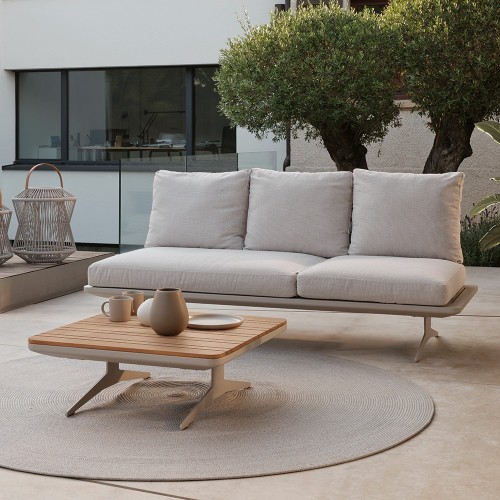 23. Stern Enya 2-teilig Dreisitzer Alu greige Rückenteil Outdoorstoff Vanilla und Kissen Vanilla mit Lounge-Tisch
