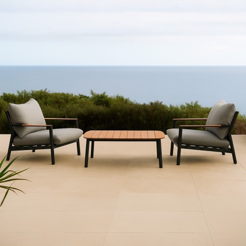 17. Lola Monaco 2x Lounge Sessel Alu Graphite Teak Kissen Pepper mit Kaffeetisch