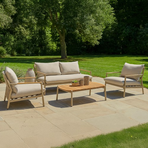 Lola Monaco Loungemöbel Set 4-teilig Alu Sand Teak / Rope Ivory / Kissen Beige mit Kaffeetisch