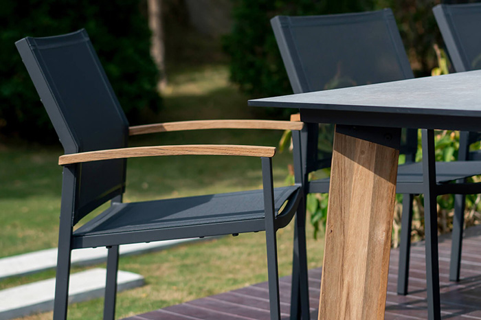 5. Zebra Stapelsessel ALEX Aluminium graphit mit Batyline ebony und Armlehnen aus Teakholz