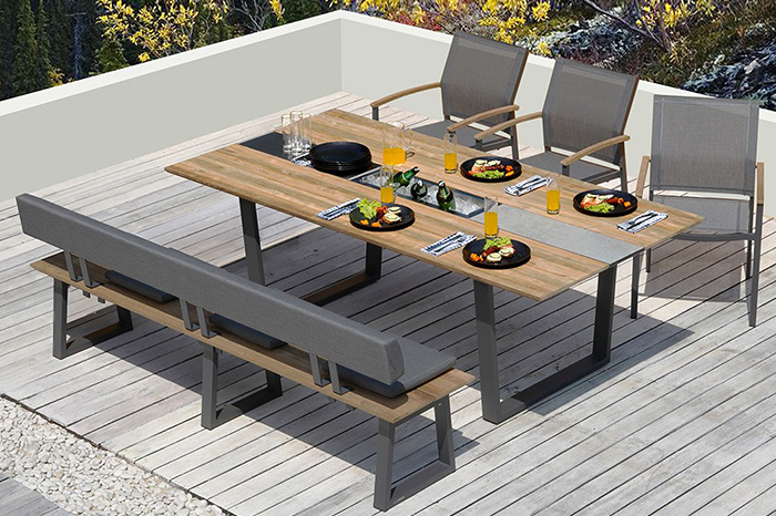 8. Zebra Tisch ALEX Aluminium graphit mit Tischplatte recycelt Teak, 180x100 cm