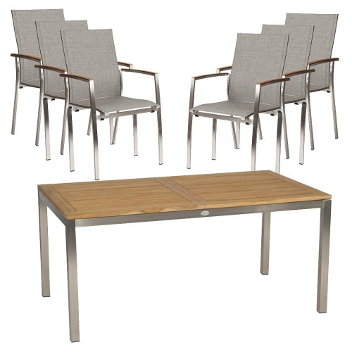 14. Stern 6x Stapelsessel Cardiff Edelstahl silbergrau und Ausziehtisch 162/220x90 mit Teakplatte