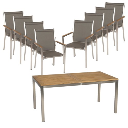 15. Stern 8x Stapelsessel Cardiff Edelstahl silbergrau und Ausziehtisch 162/220x90 mit Teakplatte