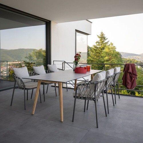 24. Stern 6x Sessel Klea Alu anthrazit Kordel Stone Kissenset perlgrau mit Tisch 220x100 cm Interno Teak Beine Tischplatte Stone light