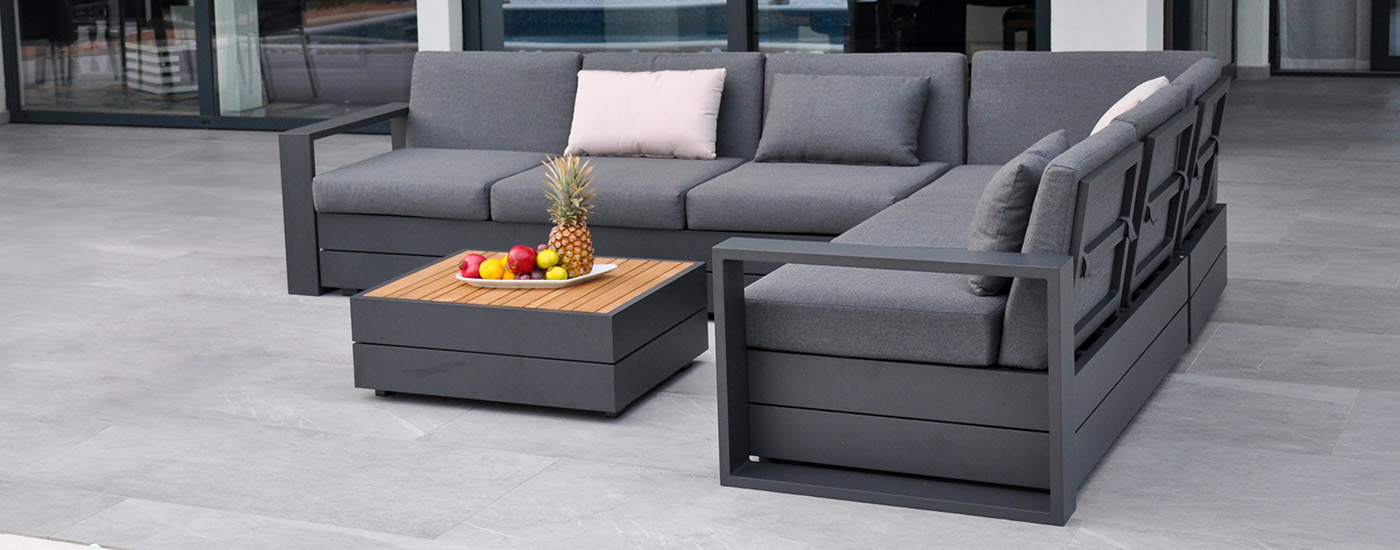 Das pulverbeschichtete Aluminium verleiht dem Set eine elegante Graphitoptik und sorgt für exzellente Wetterbeständigkeit. Die Tuva Textil Kissen aus langlebigem Polyacryl sind wasserabweisend und UV-beständig, sodass sie auch bei intensiver Sonneneinstrahlung oder Regen ihre Form und Farbe bewahren. Diese wetterfesten Materialien garantieren eine lange Lebensdauer.