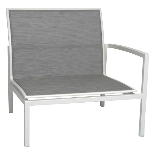 1. Stern SKELBY Lounge Seitenelement weiß mit Textilenbezug silber und Aluminiumarmlehne links