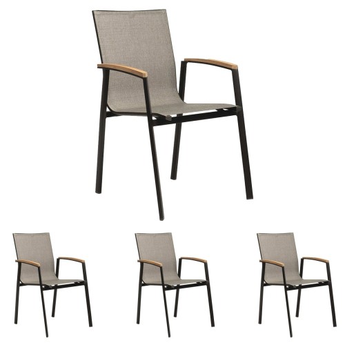 14. 4x Stern Stapelsessel New Top Aluminium schwarz matt mit Bezug Textilen Leinen grau/Teakarmlehnen