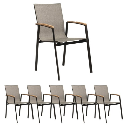 15. 6x Stern Stapelsessel New Top Aluminium schwarz matt mit Bezug Textilen Leinen grau/Teakarmlehnen