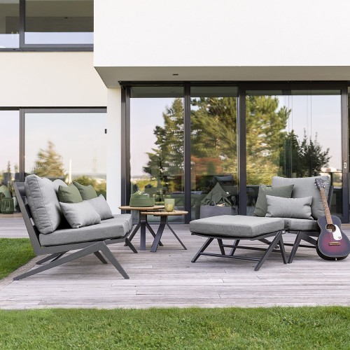 2. Stern Jackie Lounge Set 2-Sitzer, Loungesessel und Hocker Alu anthrazit Kissen seidengrau mit Beistelltisch Tischplatte Teak