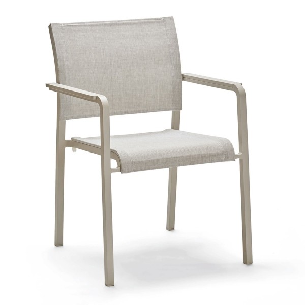 1x Stern Bank Tammo 2-Sitzer Aluminium greige Kordel greige Kissenset 100% Polyacryl Vanilla 1x Stern Kufentisch 160x90 cm Aluminium greige mit Tischplatte Silverstar 2.0 Dekor Stone 2x Stern Stapelsessel Tilo Aluminium greige Textilen Sesam/Aluminiumarmlehnen greige